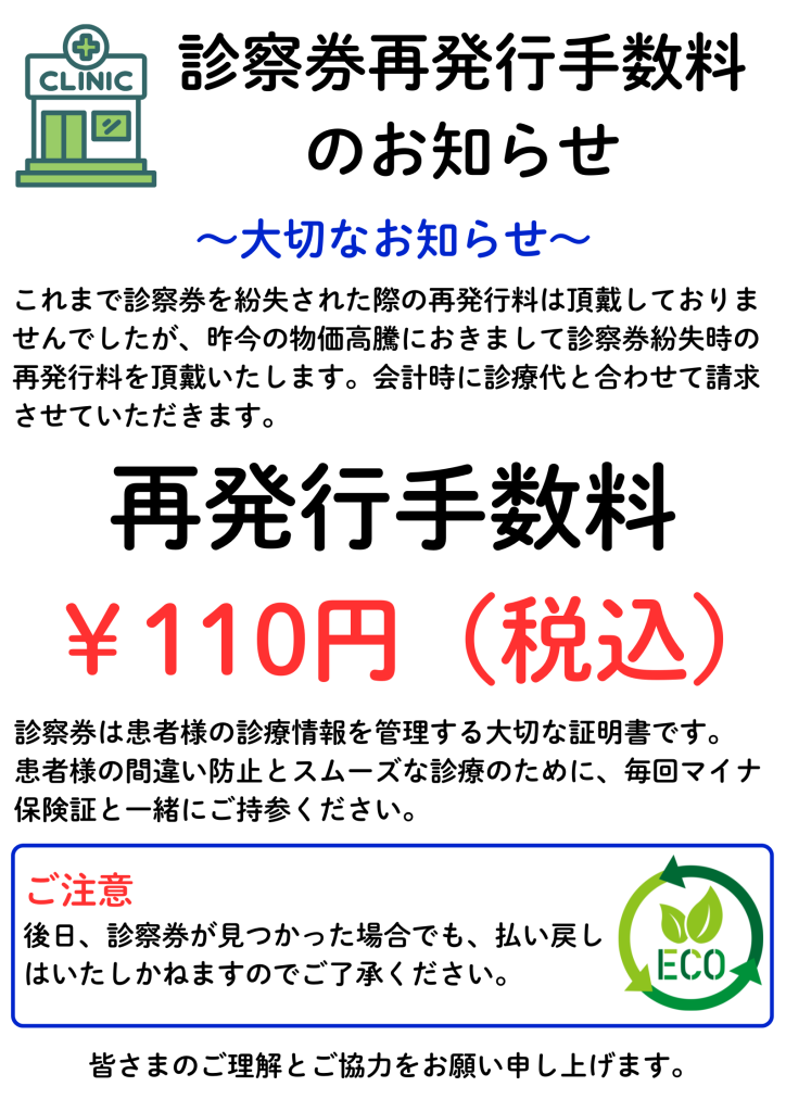 これまで診察券を紛失された際の再発行料は頂戴しておりませんでしたが、昨今の物価高騰におきまして診察券紛失時の再発行料を令和7年9月19日より頂戴いたします。会計時に診療代と合わせて請求させていただきます。